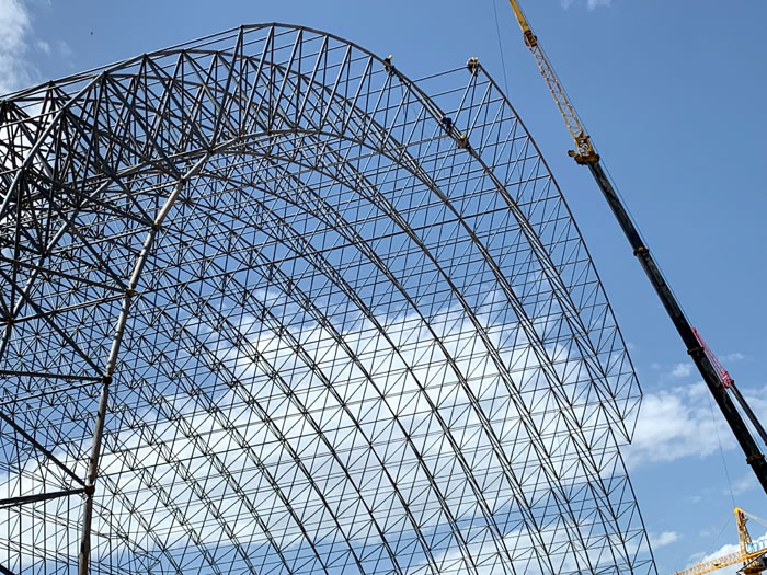 (2)网架加工前应对现场尺寸进行复测,确认无误后方可进行加工、安装;网架制作、运输、安装应遵守《空间网格结构技术规程》JGJ7-2010、《钢网架铁力螺栓球节点》JG/T 10-2009、《钢网架铁力螺栓球节点用高强度螺栓》 GB/T 16939-2016、《铁力钢结构铁力工程铁力施工规范》 GB50755-2012、《铁力钢结构铁力工程铁力施工质量验收标准》 GB50205-2020。